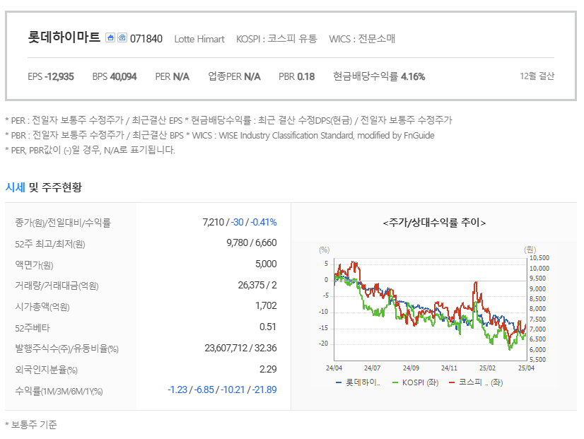 그럼에도 불구하고, 투자자로서 롯데하이마트를 완전히 외면할 이유는 없습니다. 현재 주가는 주가순자산비율(PBR) 0.4배 수준, PER도 6~7배대에 불과합니다. 명백한 저평가 구간이며, 배당과 리스크를 감안하더라도 ‘주가 반등’의 여지는 충분합니다.